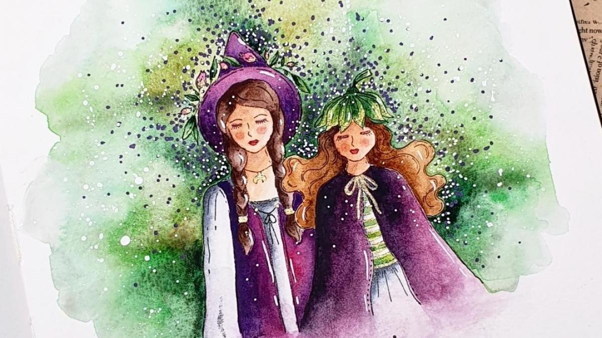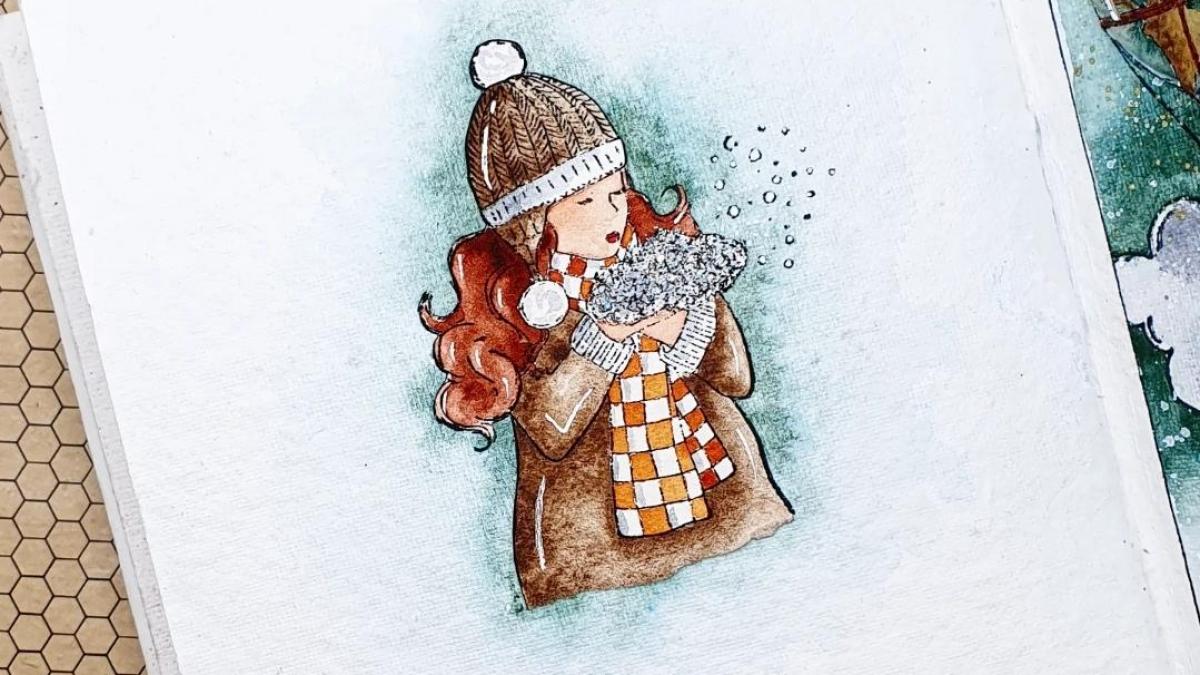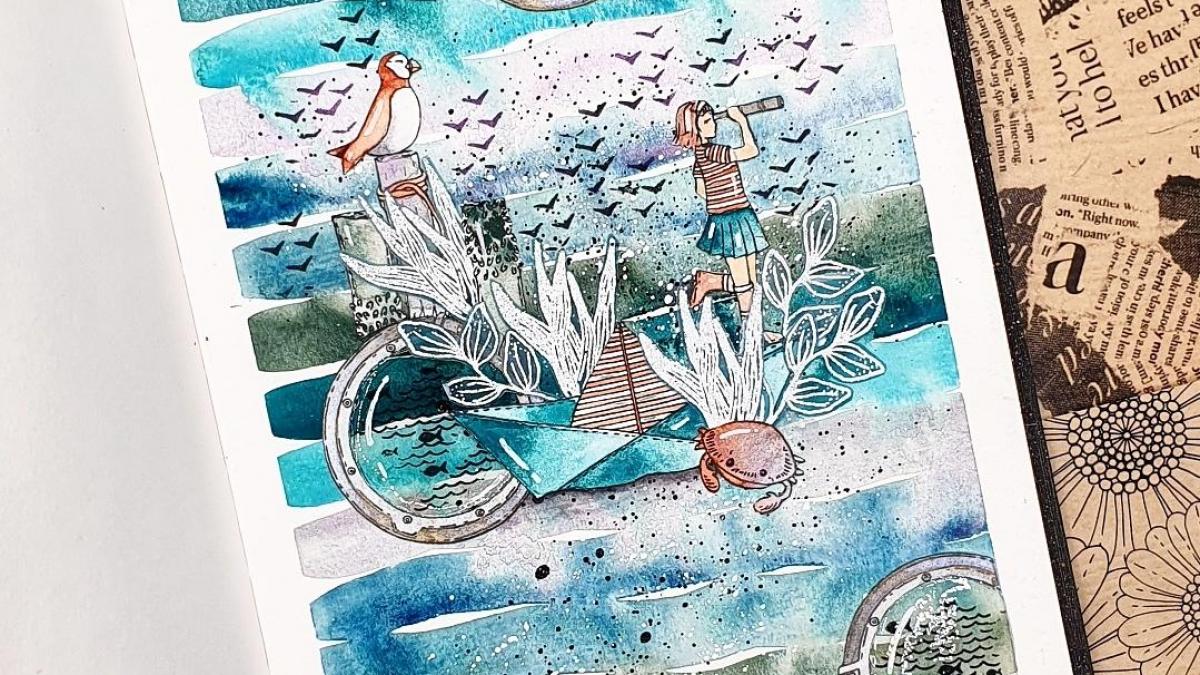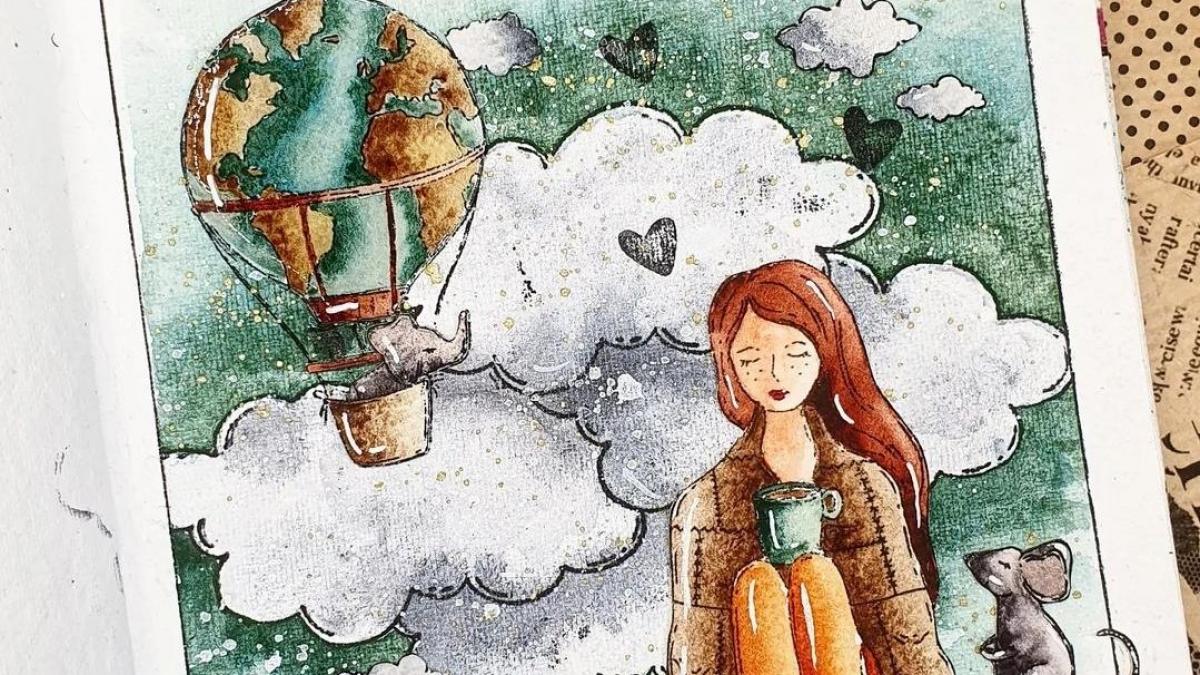 • Art Journal: jeune fille et la lune, aquarelle et Chou&flowers