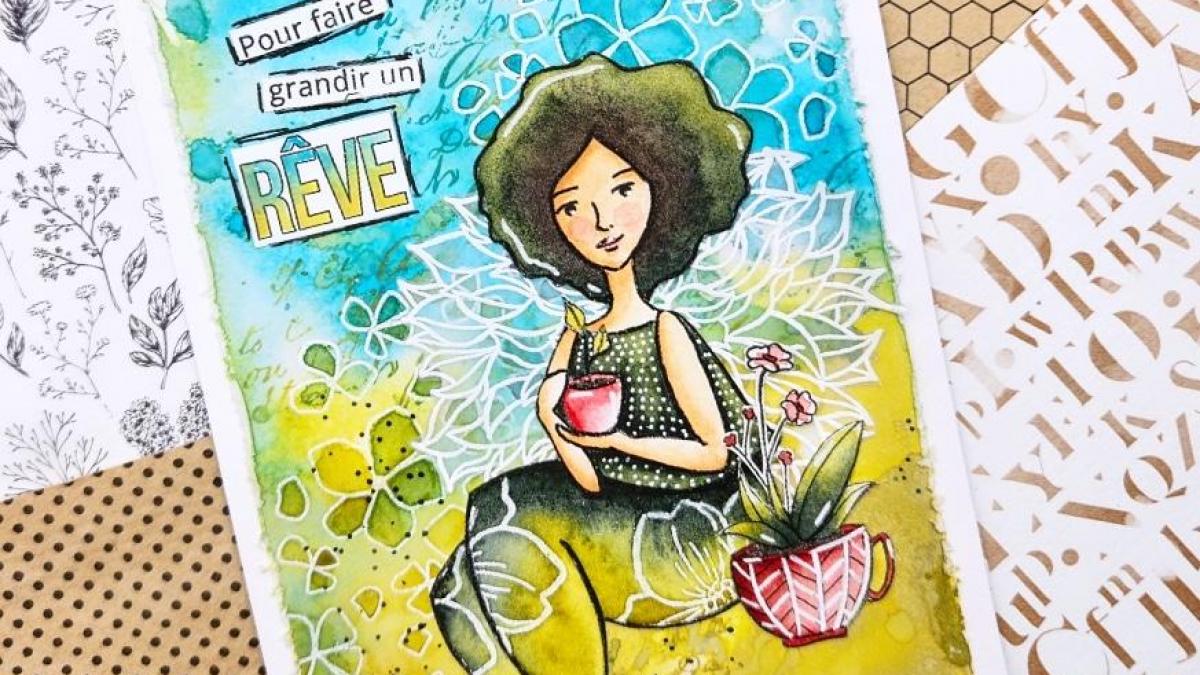 • CARTE P'TITE NANA PRINTANIERE AUX CRAYONS AQUARELLABLES