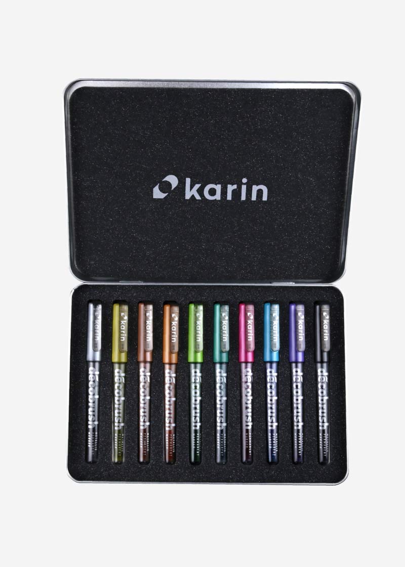 Karin décline également ses feutres sous une forme métallique comprenant 9 nuances. Les markers peuvent être utilisés sur divers supports comme le papier, le bois, la céramique, le verre, le métal ou le plastique. Ces feutres sont livrés dans une boite en métal permettant de les conserver à l'horizontale.